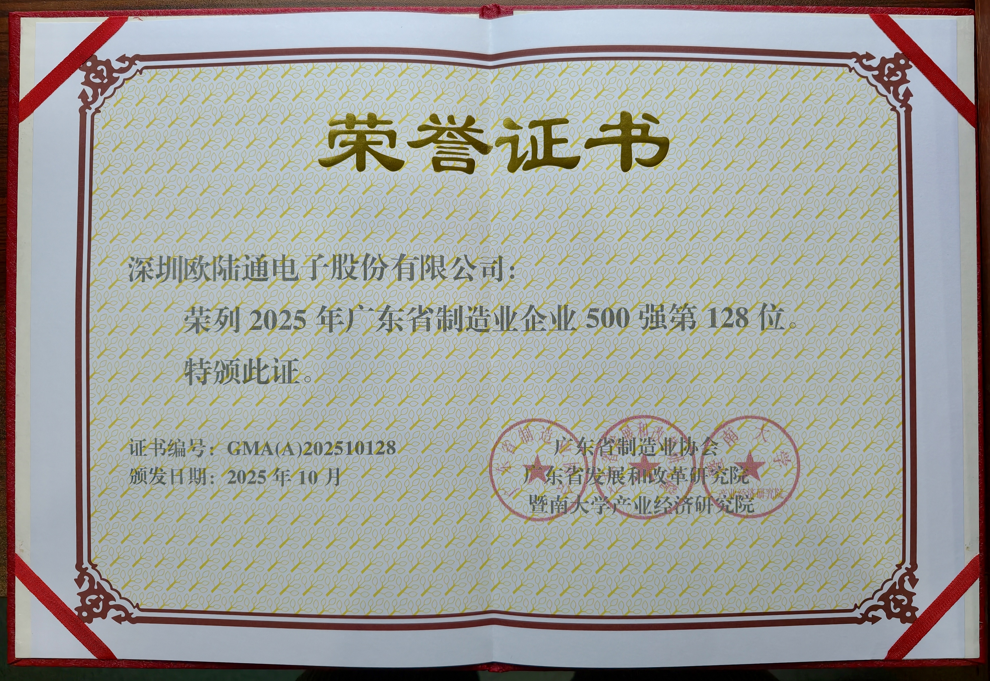 10月29日,2025年廣東省制造業(yè)500強(qiáng)企業(yè)峰會在東莞圓滿舉行,會上發(fā)布了“2025年廣東省制造業(yè)500強(qiáng)榜單”。歐陸通再次入選該榜單,位列第128位,較去年提升36位,充分彰顯了公司在先進(jìn)制造領(lǐng)域的穩(wěn)健發(fā)展態(tài)勢。