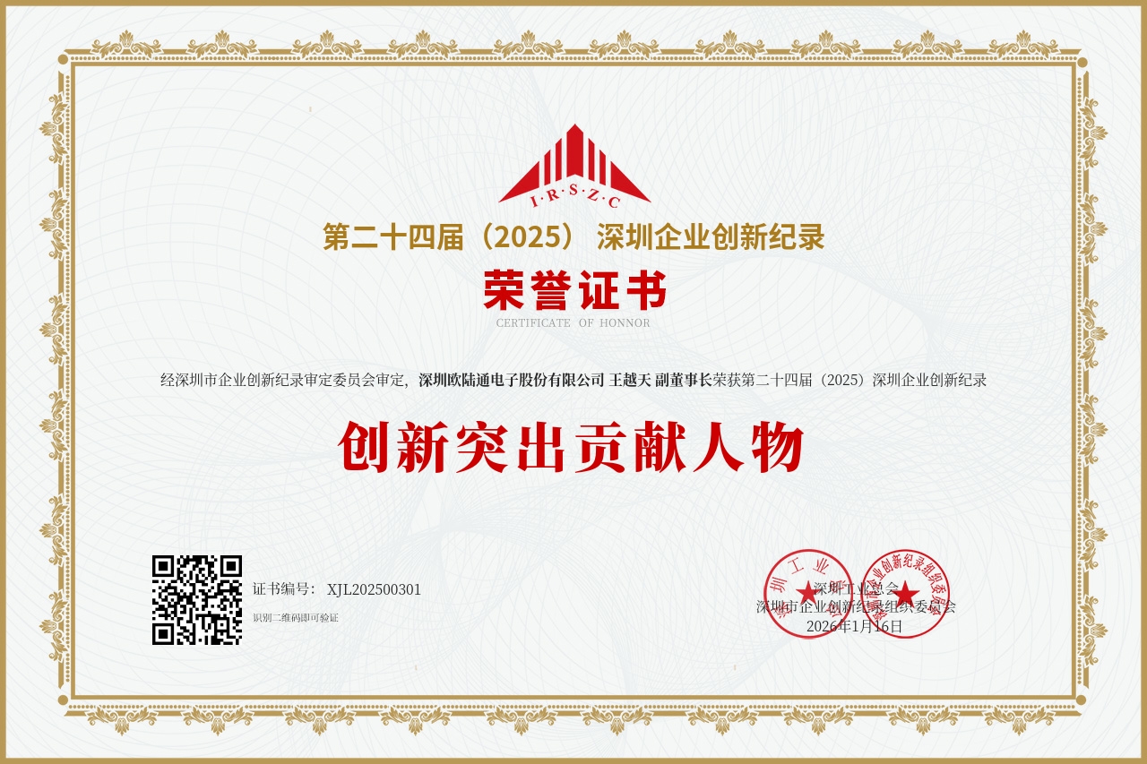 憑借在技術(shù)創(chuàng)新、區(qū)域產(chǎn)業(yè)引領(lǐng)、社會(huì)責(zé)任踐行等維度的綜合表現(xiàn),歐陸通一舉斬獲九項(xiàng)大獎(jiǎng)。歐陸通入選“2025粵港澳大灣區(qū)企業(yè)創(chuàng)新力榜單-創(chuàng)新成就榜”,榮獲“深圳工匠培育示范單位”、“2025年度履行社會(huì)責(zé)任杰出企業(yè)”、“第二十四屆深圳企業(yè)創(chuàng)新紀(jì)錄-自主創(chuàng)新標(biāo)桿企業(yè)”獎(jiǎng)以及兩項(xiàng)“第二十四屆深圳企業(yè)創(chuàng)新(中國(guó))紀(jì)錄”;歐陸通董事長(zhǎng)兼總經(jīng)理王合球先生,榮獲“2025年度履行社會(huì)責(zé)任杰出人物”;歐陸通副董事長(zhǎng)王越天先生,入選“2025粵港澳大灣區(qū)企業(yè)創(chuàng)新力榜單-創(chuàng)新杰出人物榜”,榮獲“第二十四屆深圳企業(yè)創(chuàng)新紀(jì)錄-創(chuàng)新突出貢獻(xiàn)人物”。