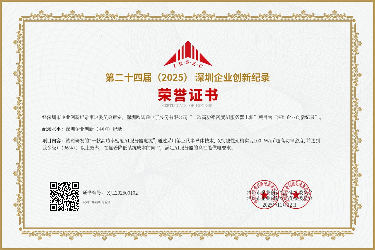 其中,歐陸通申報(bào)的“一款高功率密度AI服務(wù)器電源”、“一款大功率PoE網(wǎng)絡(luò)通訊電源”兩個(gè)項(xiàng)目被審定為“第二十四屆深圳企業(yè)創(chuàng)新(中國(guó))紀(jì)錄”,并入選第二十四屆深圳企業(yè)創(chuàng)新紀(jì)錄“自主創(chuàng)新標(biāo)桿企業(yè)”。同時(shí),公司副董事長(zhǎng)王越天先生獲授“第二十四屆深圳創(chuàng)新紀(jì)錄——?jiǎng)?chuàng)新突出貢獻(xiàn)人物”。