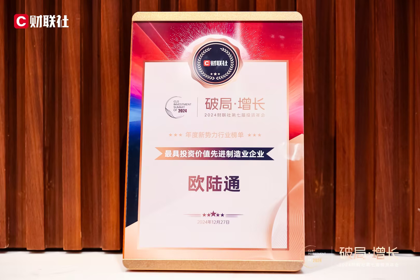 12月27日,2024財(cái)聯(lián)社第七屆投資年會(huì)在上海舉辦,邀請(qǐng)各界嘉賓解讀政策紅利,探討新舊動(dòng)能轉(zhuǎn)換中的新機(jī)會(huì),共同尋找經(jīng)濟(jì)發(fā)展新路徑。會(huì)上公布了“2024財(cái)聯(lián)社資本市場(chǎng)最具價(jià)值影響力榜單”,歐陸通獲評(píng)“最具投資價(jià)值先進(jìn)制造業(yè)企業(yè)”稱(chēng)號(hào)。