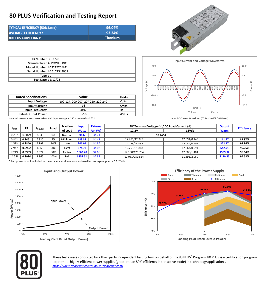 ASPOWER歐陸通 AC3212TCAM1采用1U緊湊機(jī)身設(shè)計(jì),額定輸出功率達(dá)3200W,輸入規(guī)格支持100–127V及200–240Vac全球?qū)掚妷狠斎?,額定輸入電流16A。能效表現(xiàn)尤為亮眼,在230V工況下,5%/10%/20%/50%/100%負(fù)載點(diǎn)效率分別達(dá)87.97%/92.86%/95.25%/96.04%/94.58%,平均效率約93.34%,空載輸入功耗僅20.32W,成功斬獲80PLUS鈦金認(rèn)證。電源DC側(cè)以12V母線為主并配備12Vsb待機(jī)輸出,供電穩(wěn)定性拉滿。